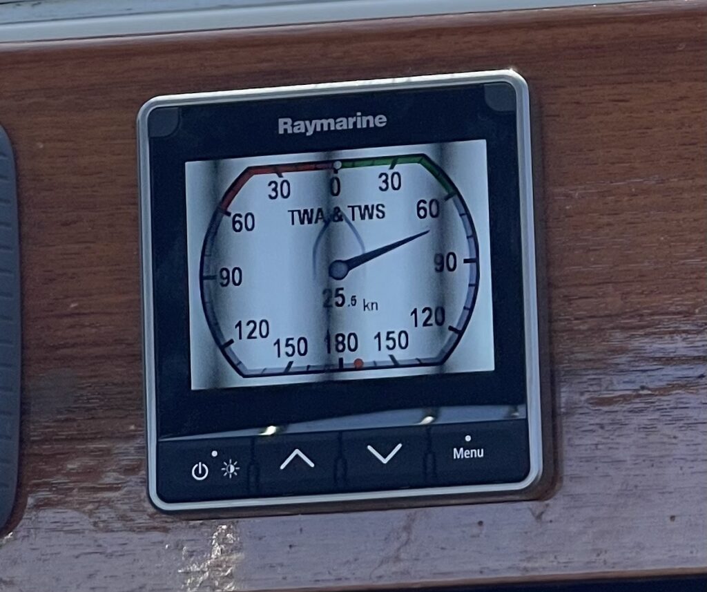 Doch der Øresund hat seine eigenen Regeln. Was die Vorhersage verschwiegen hatte, meldet sich kurz danach eindrücklich zu Wort: Der Wind zieht auf 26–28 Knoten an, Böen reißen bei 32. Und vor allem – er kommt aus der falschen Richtung. Dazu eine kurze, steile Welle. 1,5 bis 2 Meter, alle drei Sekunden. Wer noch nie in solchen Bedingungen gesegelt ist: Es ist weniger das Auf und Ab, das zermürbt – es ist der unrhythmische Takt, dieser nervenzehrende Rhythmus ohne Rhythmus, der Körper und Konzentration bis ans Limit treibt.